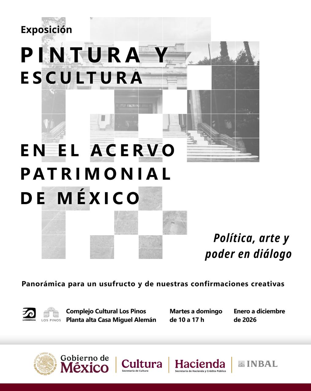El Complejo Cultural Los Pinos presenta la exposición Pintura y escultura en el acervo patrimonial de México: Panorámica para un usufructo y de nuestras confirmaciones creativas, con 67 piezas de artistas como Joy Laville, Vicente Rojo, Luis Nishizawa, Juan Soriano, José Chávez Morado, Manuel Felguérez, Francisco Toledo, Julio Galán, Alberto Castro Leñero, Beatriz Zamora, Gerardo Murillo Dr. Atl y Gilberto Aceves Navarro, entre otros.