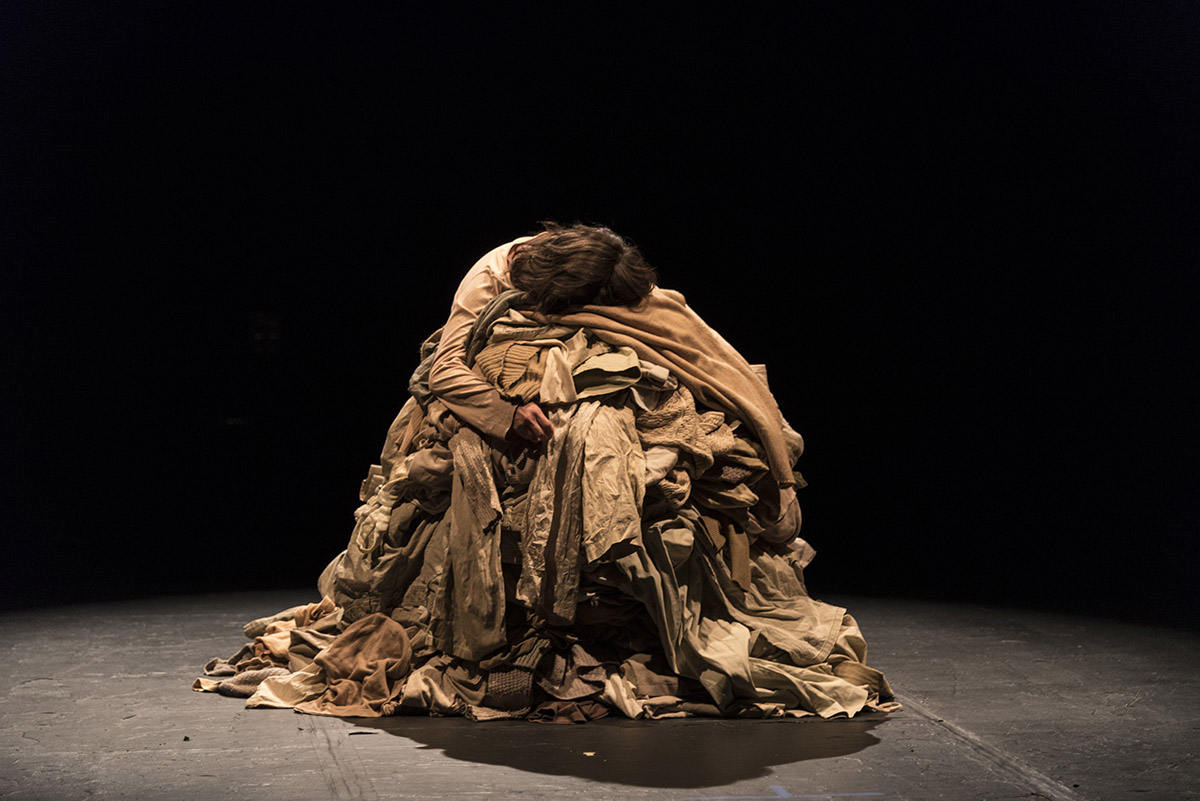De una montaña de ropa —construida a partir del pantone de varias pieles durante un proceso de cuatro años— que ocupa el espacio, emerge una figura humana que se ha fundido hasta perder su contorno. Estas esculturas vivas, son cuerpos que se reorganizan frente al espectador.